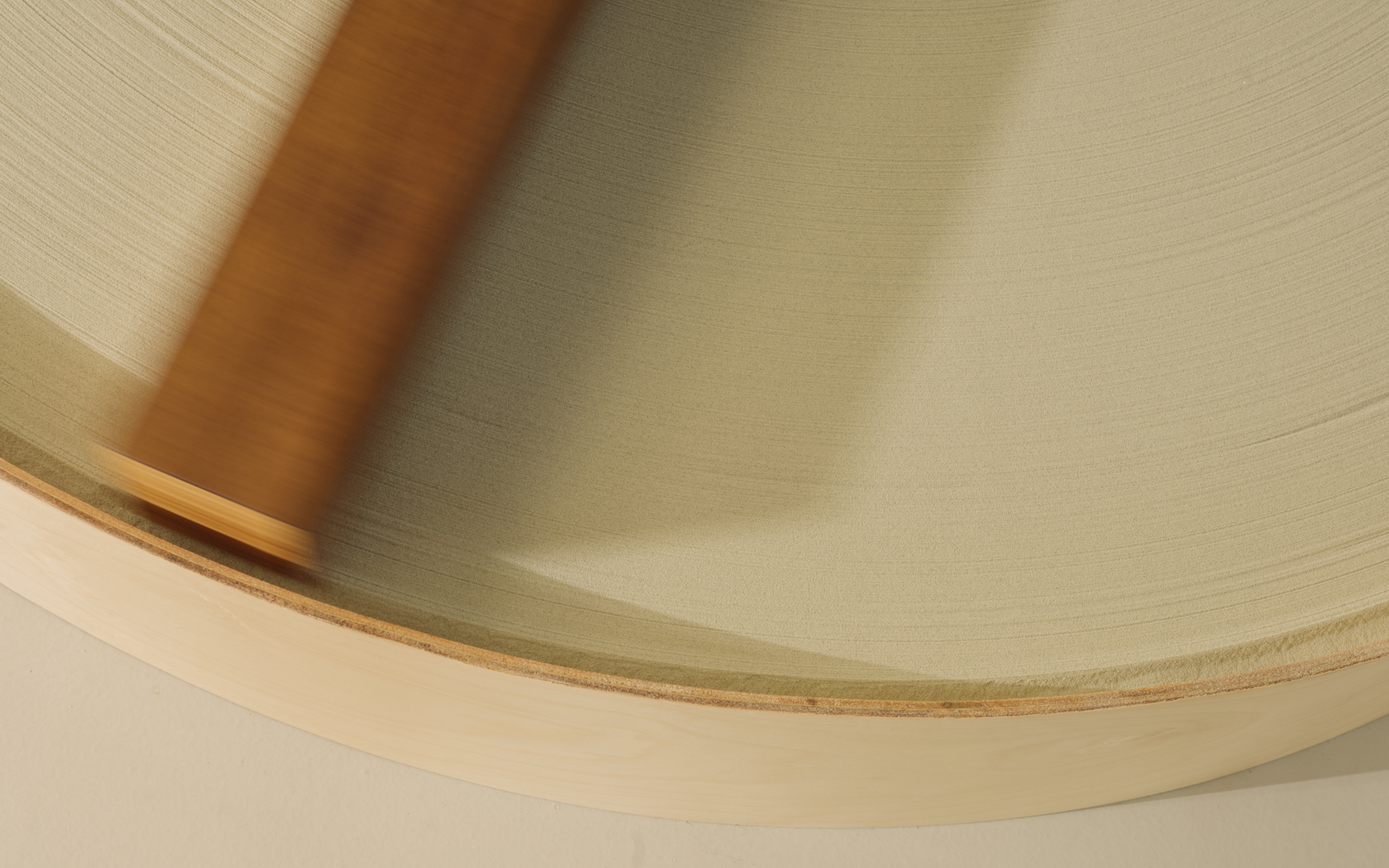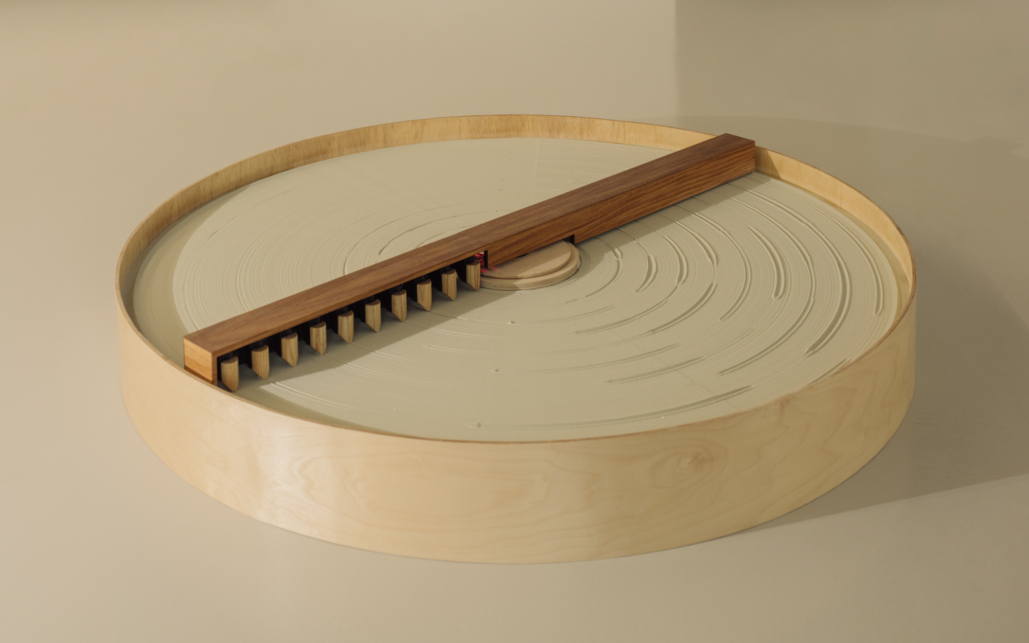 A rotating beam sits atop a bed of sand, inscribing patterns into the sand below. The sand is ground olivine, a green volcanic mineral that is found abundantly in the Earth’s subsurface. When seawater meets olivine, a reaction occurs that pulls carbon dioxide out of the air and the carbon finds its way to the bottom of the sea, stored as carbon deposits. This process—mineral weathering—constitutes one of the Earth’s natural mechanisms to regulate its carbon level and functions as an important carbon sink.